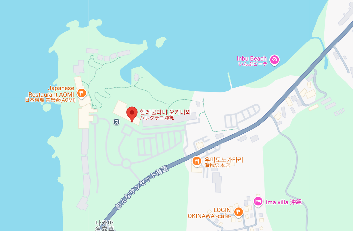 할레쿨라니 오키나와는 오키나와 중부 온나손 지역에 위치하고 있습니다. 바로 앞에는 니리이 해변(Nirii Beach)이 펼쳐져 있고, 모든 객실에서 바다를 감상할 수 있는 설계가 특징입니다.